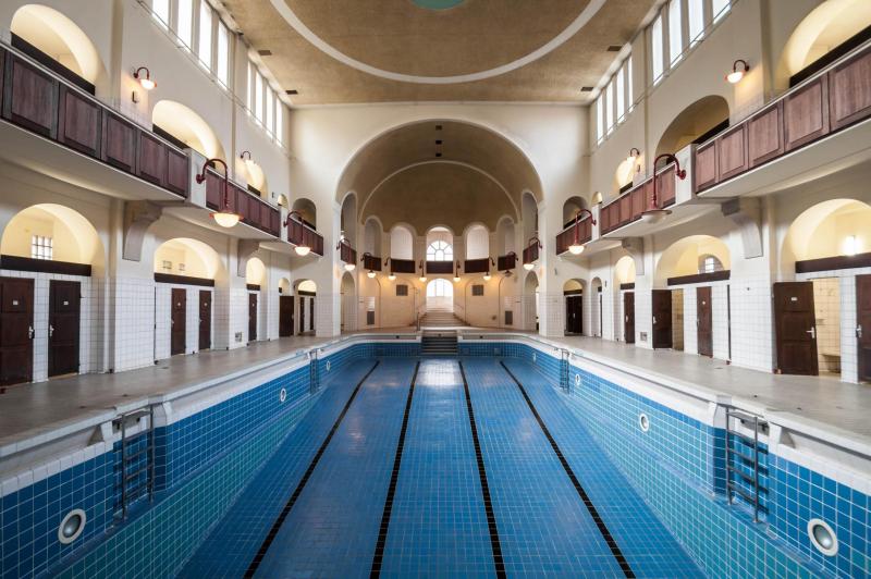 The public bath, constructed in the style of Art Nouveau, consists of three pools (two for men, one for women). Additionally, it had several showers, steam- and public baths and even an own bath for dogs. It was opened in 1914 after a construction time of three years (1911 - 1913). In the same year it was shortly closed due to the start of World War I. The entry prices at that time were between 10 - 40 pfennig (former German currency).